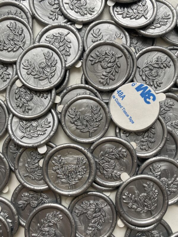 В наявності. Сургучний відтиск срібний, дизайн квіти, зі скотчем.